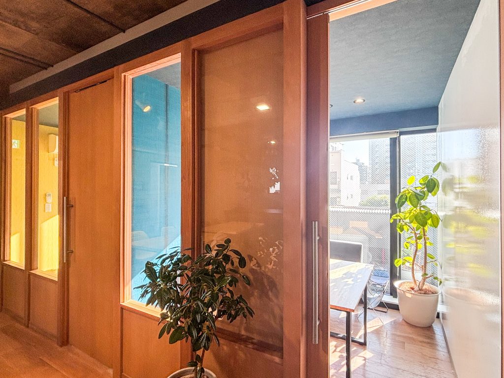 2025.10.20 施設紹介 スタッフ 会議室2 会議室2はソファを採用していて、会議室1よりもリラックスできるような雰囲気の部屋です。社内の打ち合わせや、お一人でのWEBセミナー参加などにぴったりです。必要であればモニターを持ち込むこともできますよ☺フリースペースから見るとこのような感じです。 会議室2も壁はホワイトボードになっています。 ホワイトボードイレーザーで擦れば簡単に消すこともできるので、会議にはもってこいの壁です。