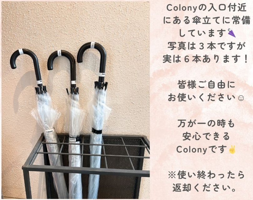 2025.10.24 お知らせ スタッフ 貸し出し傘🌂 突然の雨に備えて、Colonyには貸出傘を用意しています☔ 利用後はご返却くださいますようお願い申し上げます。 常時3本傘立てに置いていますが、それ以上必要な場合はコンシェルジュにお申し付けください☺最大6本まで貸し出しできます!